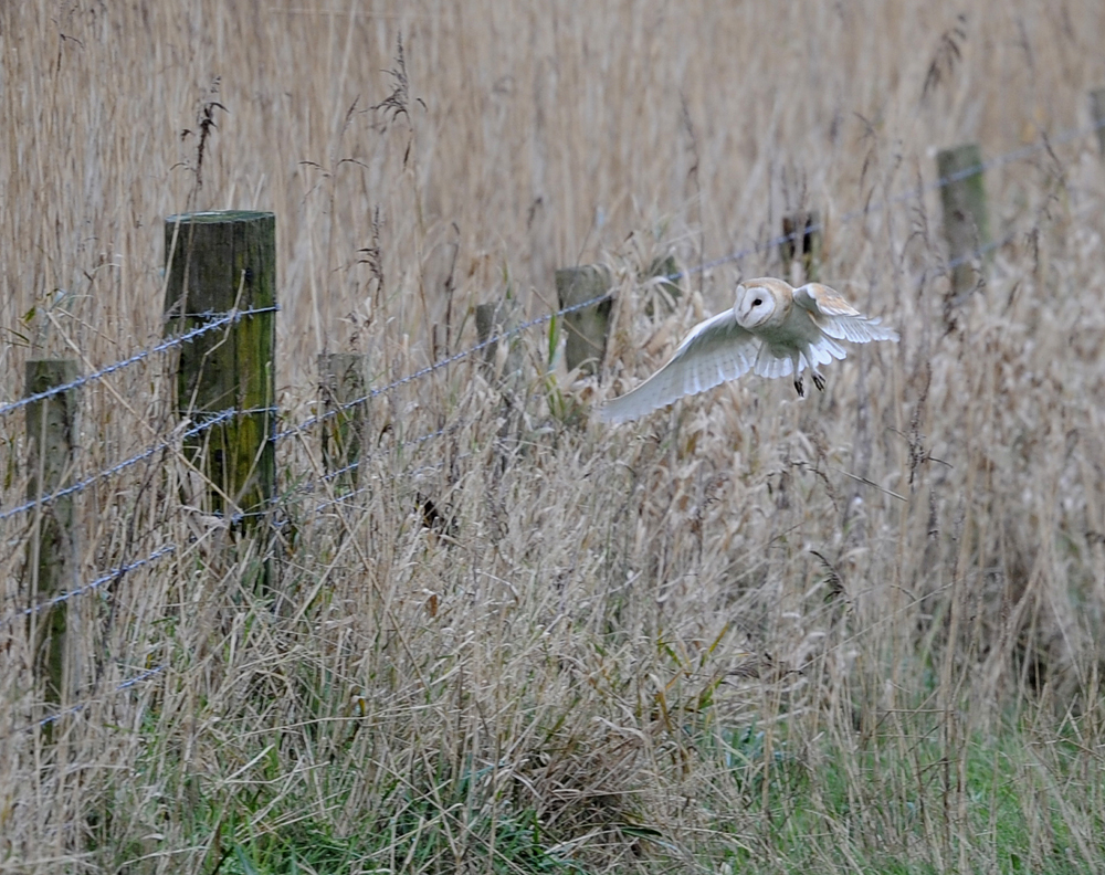 For my first post of the New Year I will concentrate on the barn owl. I had noted that barn owls were being seen on a daily basis out hunting at Martin Mere.On Tuesday afternoon therefore I was in position in the Ron Barker hide awaiting the appearance of a barn owl.It wasn't long before one was seen on a fence post but some distance away and another very distant barn owl was also spotted but again much too far away.Then suddenly another barn owl appeared at the end of the fence line close to the hide.This owl was very much in hunting mode and for the next forty minutes or so those present were treated to some fabulous views of this lovely bird.The bird was post hopping and looking for prey as it came along the fenceline towards the waiting watchers and photographers.